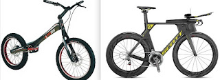 By the way, if you think about it, trials is the polar opposite of triathlon. One reduces cycling entirely to bike-handling, while the other completely eliminates it. Even the bikes couldn't be more different:
