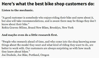 Upon which I cast my expertly critical eye and found to be basically sound, inasmuch as it's essentially a bunch of people from a bunch of bike shops offering their perspective on their customers: