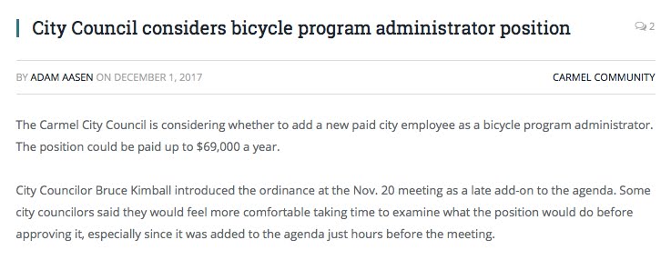 The Carmel City Council is considering whether to add a new paid city employee as a bicycle program administrator. The position could be paid up to $69,000 a year.
