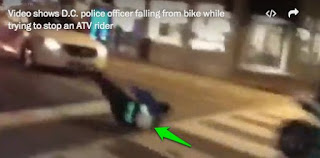 At one point in the video, an officer on a bicycle comes close to an ATV and jumps off as he tries to reach for the rider, but he misses and falls to the ground. A police cruiser following him and the ATV stops. D.C. police said the officer on the bike suffered minor injuries.